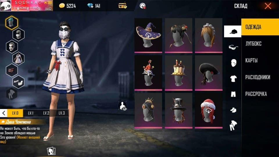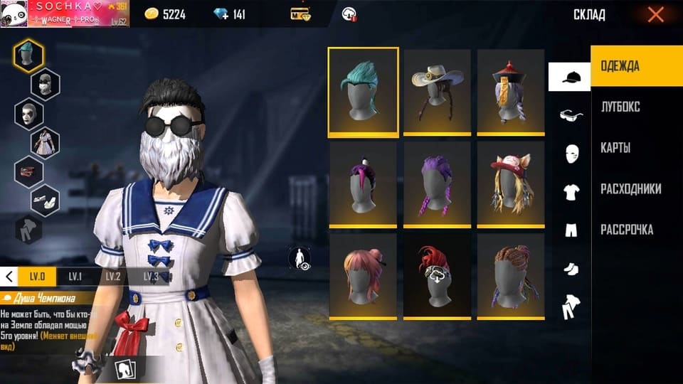 🚶‍♂️Персонажи: 26/30; 🐱Питомцы: Котенок, Механичекий щенок, Робо, Панда; ⭐️Пропуск: 11-17 сезоны; 👚Костюмы: 27; 🌈Скины на оружие: M4A1, M1014, AK, UMP, M14, SCAR, Гроза, MP40, Сковорода, СКС, Граната, Стена; ✨Скины на 🎒рюкзаки/🏂доски/🛸парашюты: 26/38/32; 🚙Скины на транспорт: ; 📈Уровень: 62; 💰Голда: 5224; 💎Алмазы: 141; ✔️Привязка: Google; ✔️Доступна смена ника; ✔️Доступна перепривязка аккаунта
