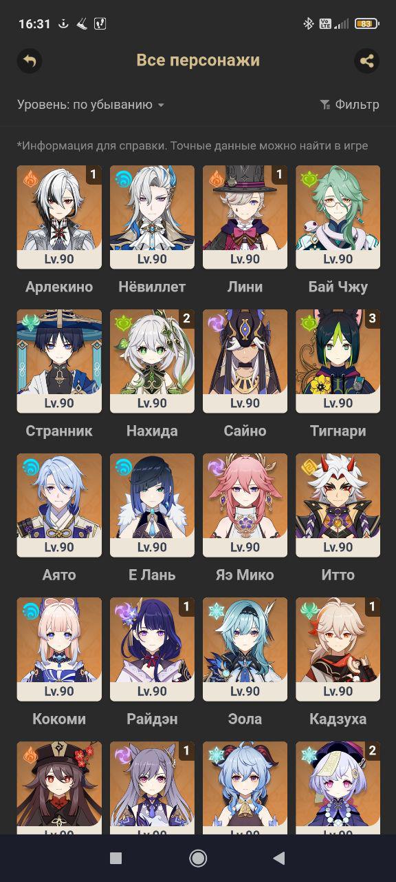 📈 Ранг: 55 🧍♀️ Персонажи: Бай чжу, Тигнари, Сайно и другие 🦾 Оружие: 5 звезд ✨ Примогемы: 85